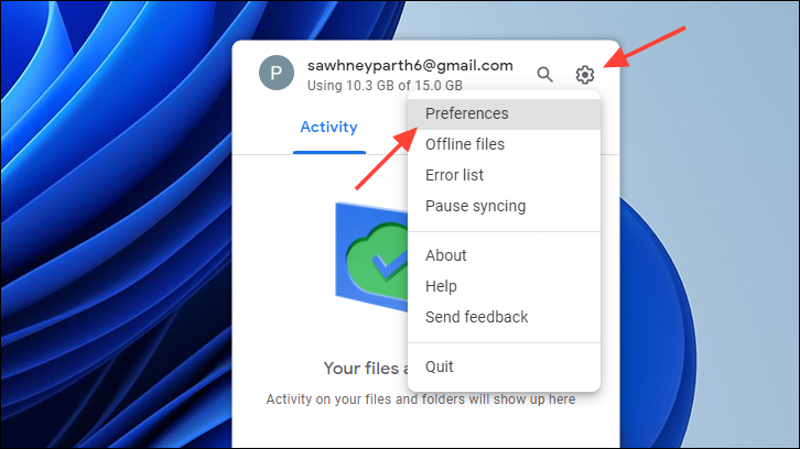 Step 1: Locate the 'Google Drive' icon in your system tray on the Taskbar. Right-click on the icon, then click the 'Gear' icon to access settings.