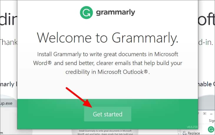 Step 3: After the download completes, open the installer file. A 'Welcome to Grammarly' screen will appear. Click on 'Get Started' to proceed.