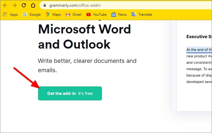 Step 1: Open a web browser and navigate to grammarly.com/office-addin. On the page, click on the 'Get the add-in' button to start the download process.