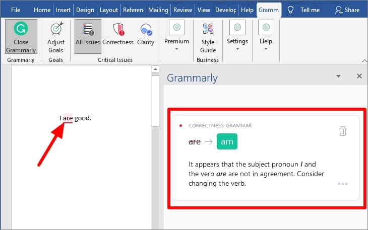 Step 3: When you start typing, any grammatical errors or suggestions will be highlighted in red. The corrections and suggestions will appear on the right-side panel of Microsoft Word.