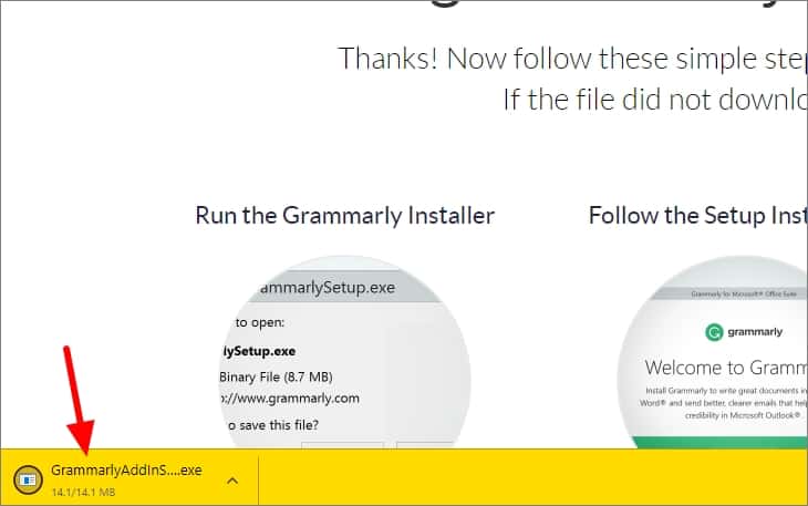 Step 2: Once you click the button, the download should begin automatically. Wait for the Grammarly add-in installer to download to your PC.