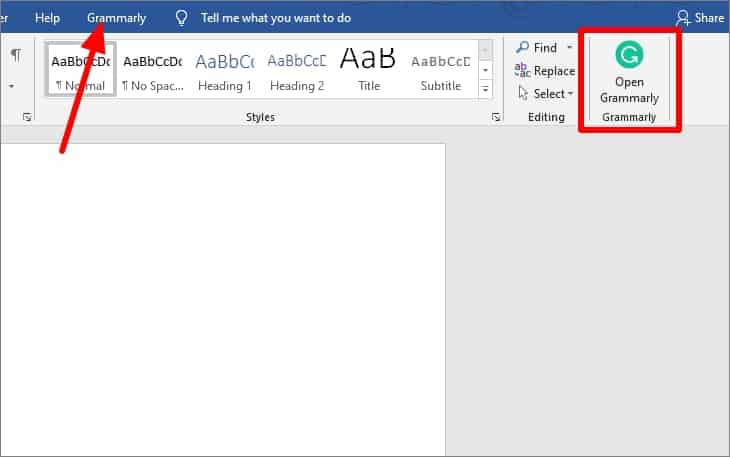 Step 1: Open Microsoft Word on your computer. You should see a new 'Grammarly' option on the menu bar, along with an 'Open Grammarly' button under the Home tab, located next to the Find and Replace options.