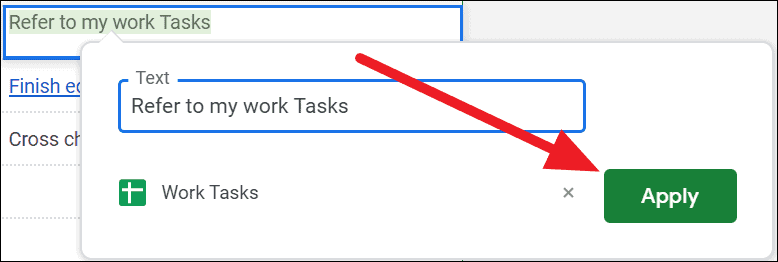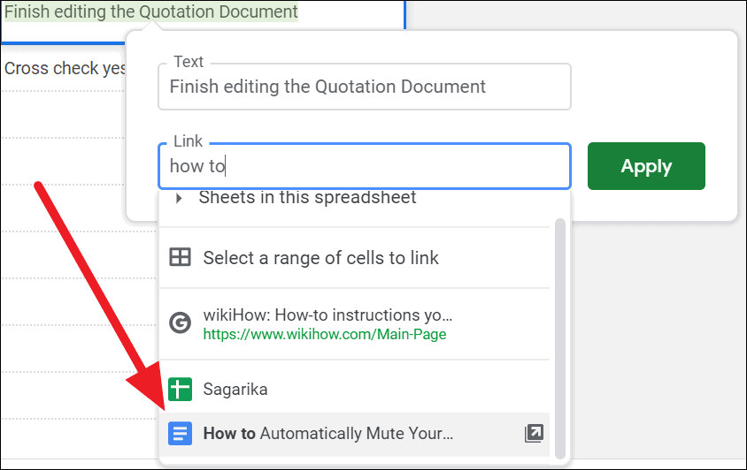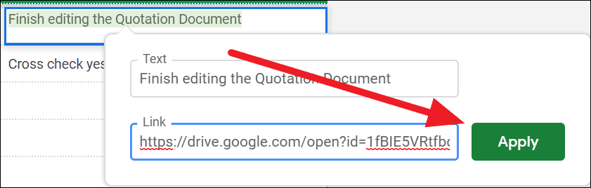 Step 4: After selecting the document, click on the Apply button to create the hyperlink. Now, when you hover over the cell, you can click the link to open the document directly in Google Drive.