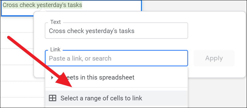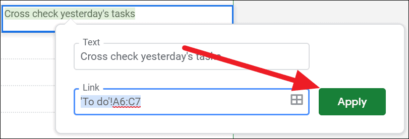 Step 5: Back in the 'Insert link' dialog box, click on the Apply button to create the hyperlink. Now, clicking on the link in the cell will take you directly to the specified range within the sheet.