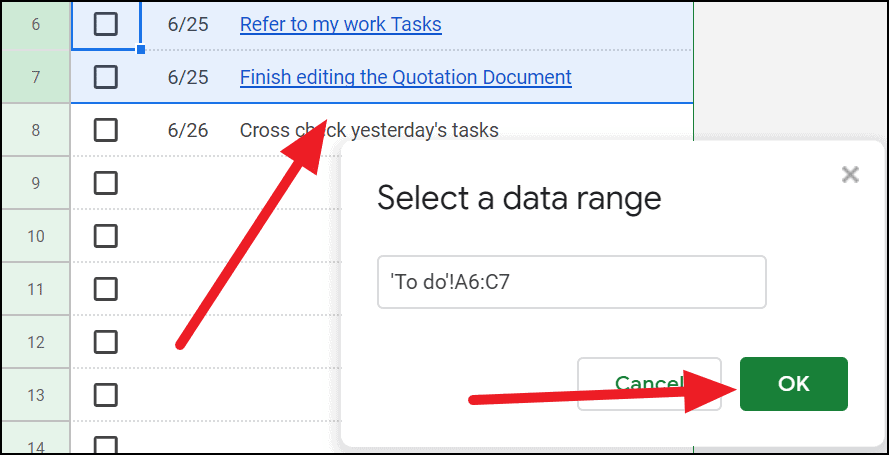 Step 4: A 'Select a data range' box will appear. Use your cursor to highlight the range of cells you want to link to, or enter the cell range manually. After selecting the range, click on the OK button.