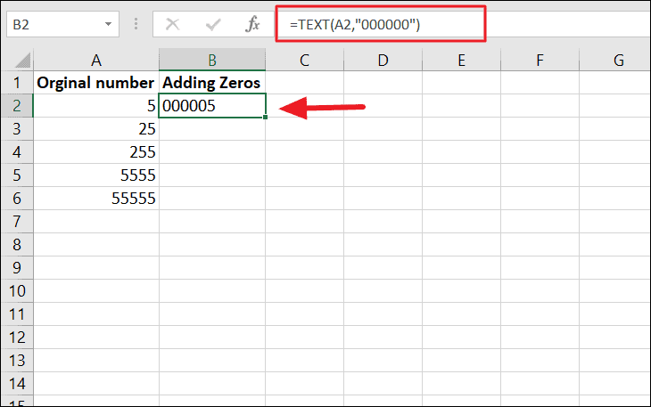 The above method adds zeros to numbers as you type them, but if you already have a list of numbers and you want to pad leading zeros before them, then the TEXT function is the right method for you. TEXT function allows you to convert numbers to text strings while applying custom formatting.