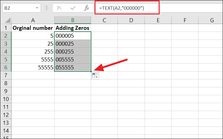 Now you can apply the same formula to the rest of the cells by dragging the fill handle. As you can see, the function converts the numbers into texts and add leading zeros to the numbers so that the total number of digits is 6.