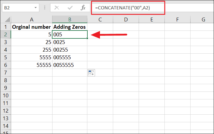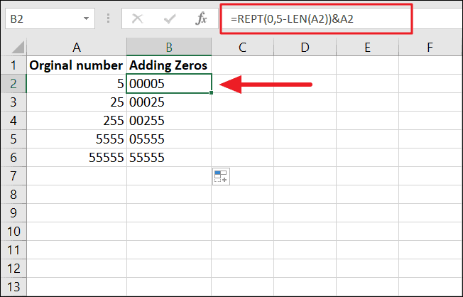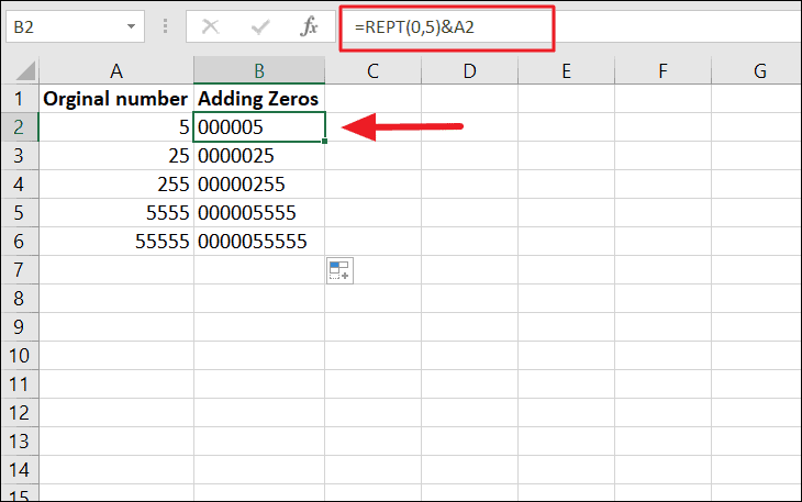 What the formula does is repeat 5 zeros and joins the number string in A2 and returns the result. Then, the formula is applied to cell B2:B6 using the fill handle.