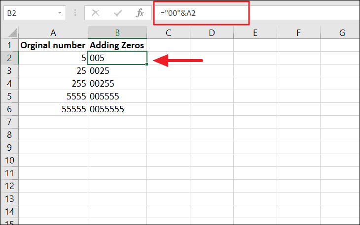 Here, ‘LEN(A2)’ gets total the length of the string/numbers in cell A2. ‘5’ is the maximum length of string/numbers the cell should have. And ‘REPT(0,5-LEN(A2))’ part adds the number of zeros by subtracting the length of the string in A2 from the maximum number of zeros (5). Then, a number of 0’s is joined before the value of A2 to make a fixed-length string.