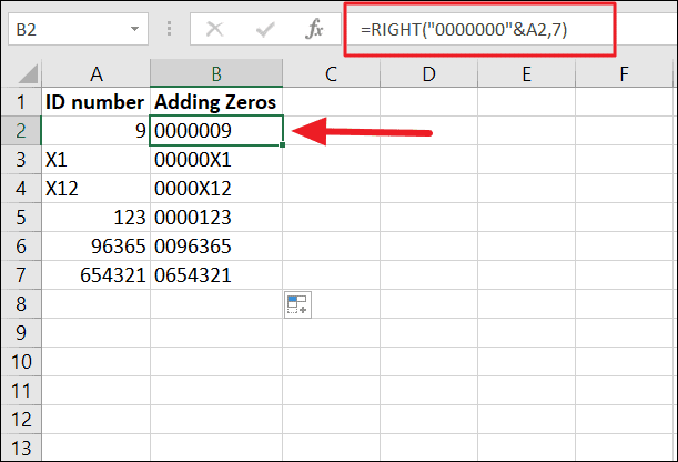 The first argument (text) of the formula adds 7 zeros to the value in A2 (“0000000”&A2), and then returns the rightmost 7 characters, which results in some leading zeros.