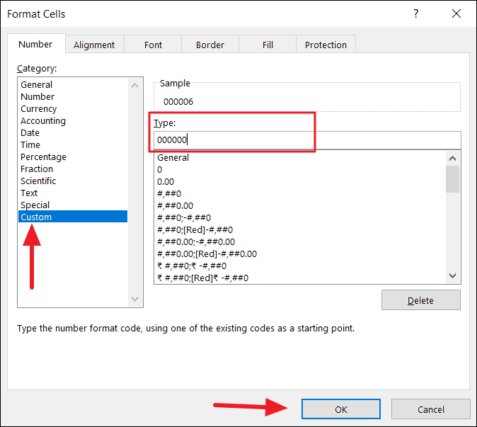 Enter the number of zeros in the ‘Type:’ box to specify the total number of digits you want to show in a cell. For example, if you want the number to be 6 digits long, then enter ‘000000’ as the custom format code. Then, click ‘OK’ to apply.