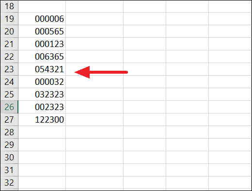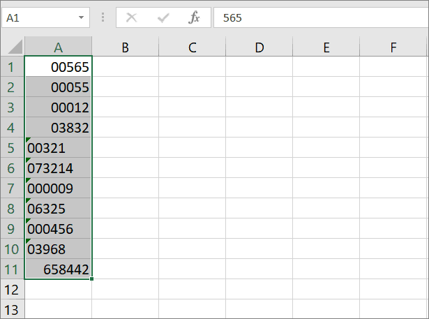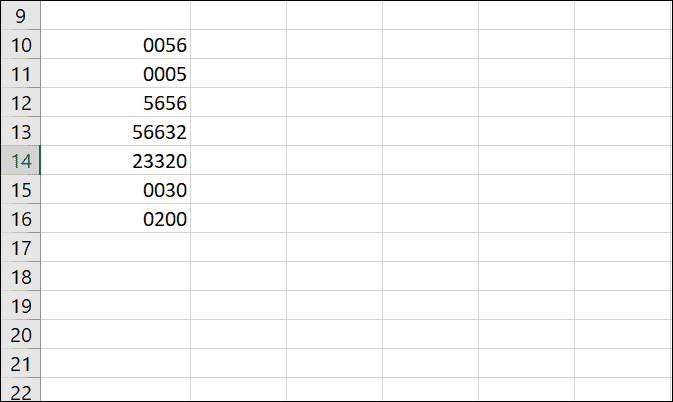 Select the range of cells that have the numbers with leading zeros.