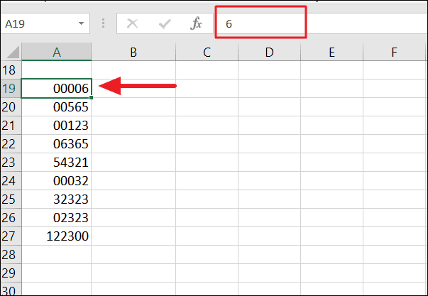Since we have 6 zeros in the second argument of the formula, the function converts the number string into a text string and adds 5 leading zeros to make the string 6 digits long.