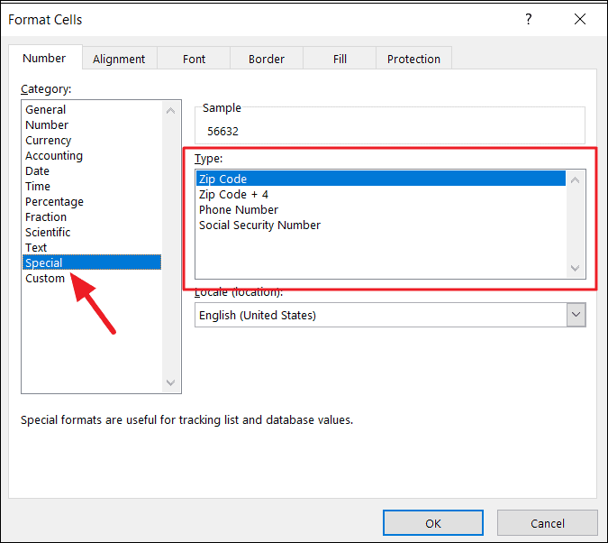 You can also use predefined format codes in the ‘Special formats’ section of the Format cells dialog box for postal codes, telephone numbers, and social security numbers.