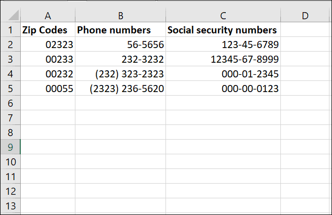 The following table shows numbers with leading zeros where different ‘Special’ format codes are applied to different columns: