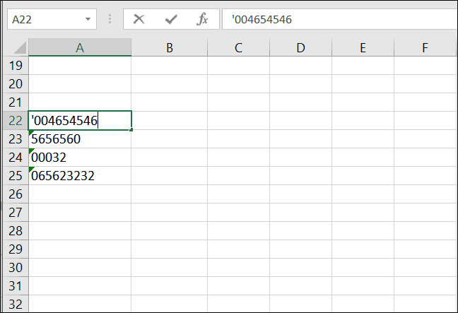 Just type an apostrophe before any numbers and hit ‘Enter’. Excel will leave the leading zeros intact, but the (‘) will not be visible in the worksheet not unless you select the cell.