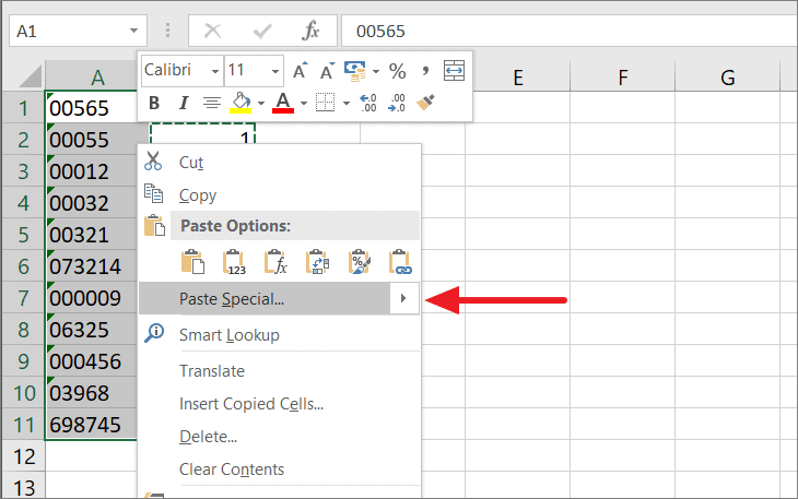 Next, select the cells in which you want to remove the leading zeros. Then, right-click on the selection and then select the ‘Paste Special’ option.