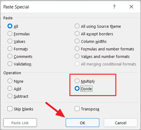 In the Paste Special dialog box, under Operation, choose either the ‘Multiply’ or ‘Divide’ option and click ‘OK’.