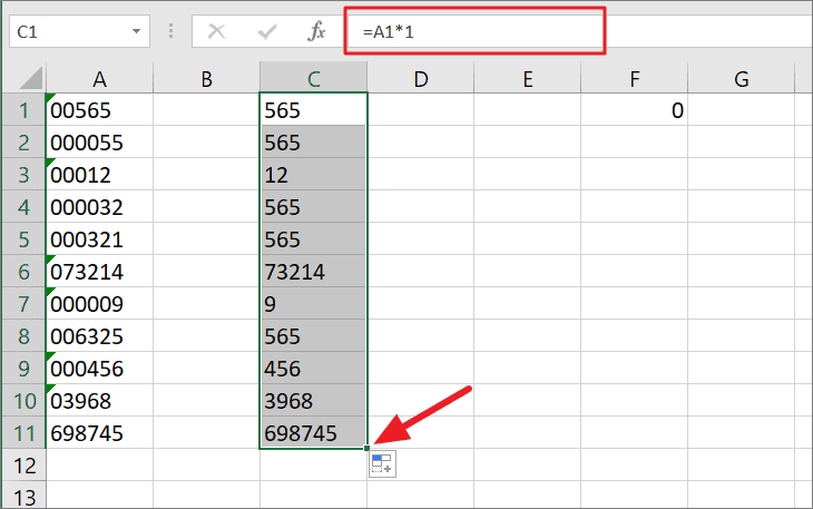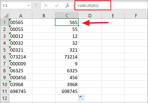 The argument of the formula could be a value or the cell reference that has the value. The formula removes the leading zeros and converts the value from text to number. Then apply the formula to the rest of the cells.
