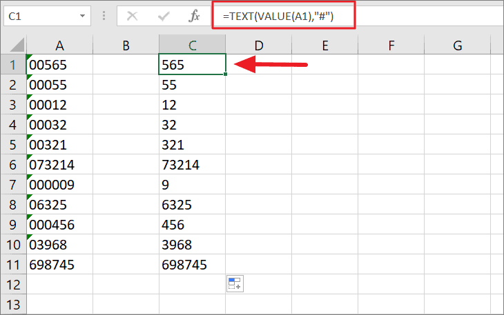 The VALUE function converts the value in A1 to number. But the second argument, ‘#’ converts the value back to text format without any extra zeros. As a result, you would get the numbers without any leading zeros but still in the text format (left-aligned).