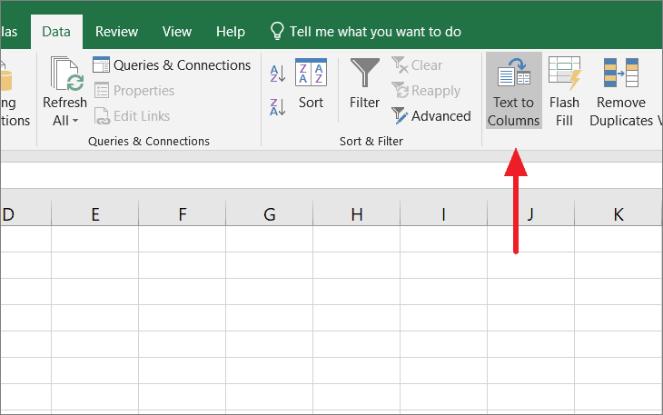 Next, go to the ‘Data’ tab and click on the ‘Text to Columns’ button in the Data Tools group.