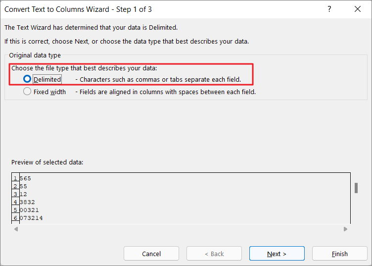 The ‘Convert Text to Columns’ wizard will appear. In step 1 of 3, select ‘Delimited’ and click ‘Next’.