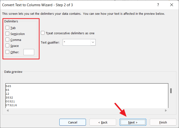 In step 2 of 3, uncheck all the delimiter and click ‘Next’.