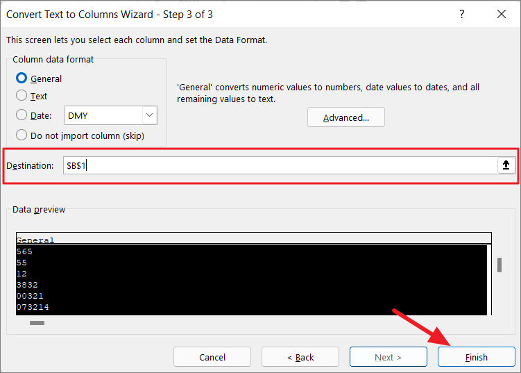 On the final step, leave the Column data format option as ‘General’ and choose the destination (the first cell of the range) where you want your numbers without leading zeros. Then, click ‘Finish’