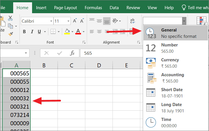 To remove the prefixed zeros, select the cells with the leading zeros, click on the ‘Number Format’ box, and select ‘General’ or ‘Number’ formatting option.