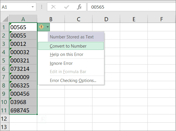 If your leading zeros were added by changing the cell format or by adding apostrophes before the numbers or automatically added when importing data, the easiest way to convert them to numbers is by using the Error Checking Option. Here’s how you do it: