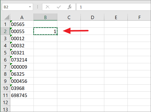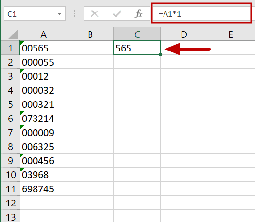 To do this, type the formula in the below example in a cell and press ENTER. The leading zeros will be removed and the string will be converted back to a number.