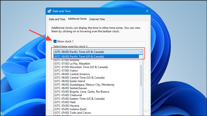 - Now, click on the 'Show clock 1' checkbox to enable it and select the time zone for which you want to add the second clock.