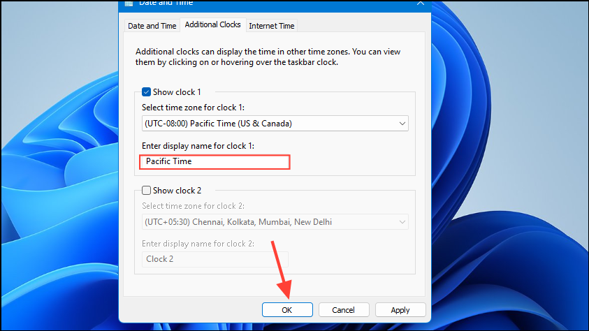 - Add a name for the second clock and click on the 'Apply' button before clicking on OK.