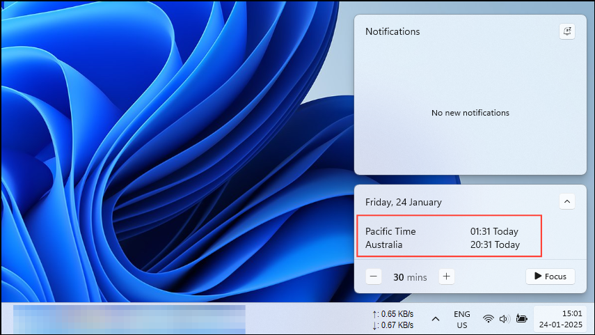 - Now, when you click on the time displayed on the right in the taskbar, a pop-up will appear showing the additional clocks from different time zones. You can also view the additional clocks by hovering your cursor over the default clock in your taskbar.