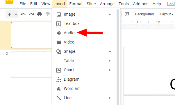 You will now see the options to add image, text, audio, video, and many others to the slide. Select ‘Audio’ from the menu.