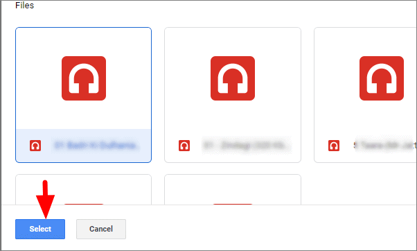 Select the music file you want to add to Google Slides and then click on ‘Select’ at the bottom.