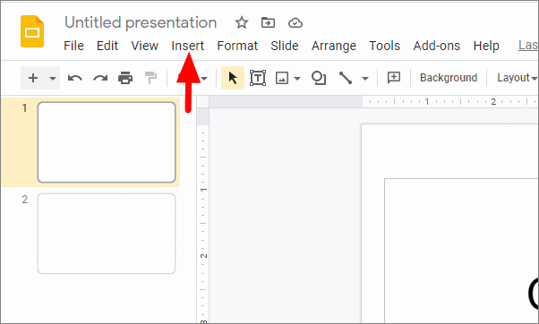 To add music to a slide in Google Slides, click on ‘Insert’ in the menu bar at the top.