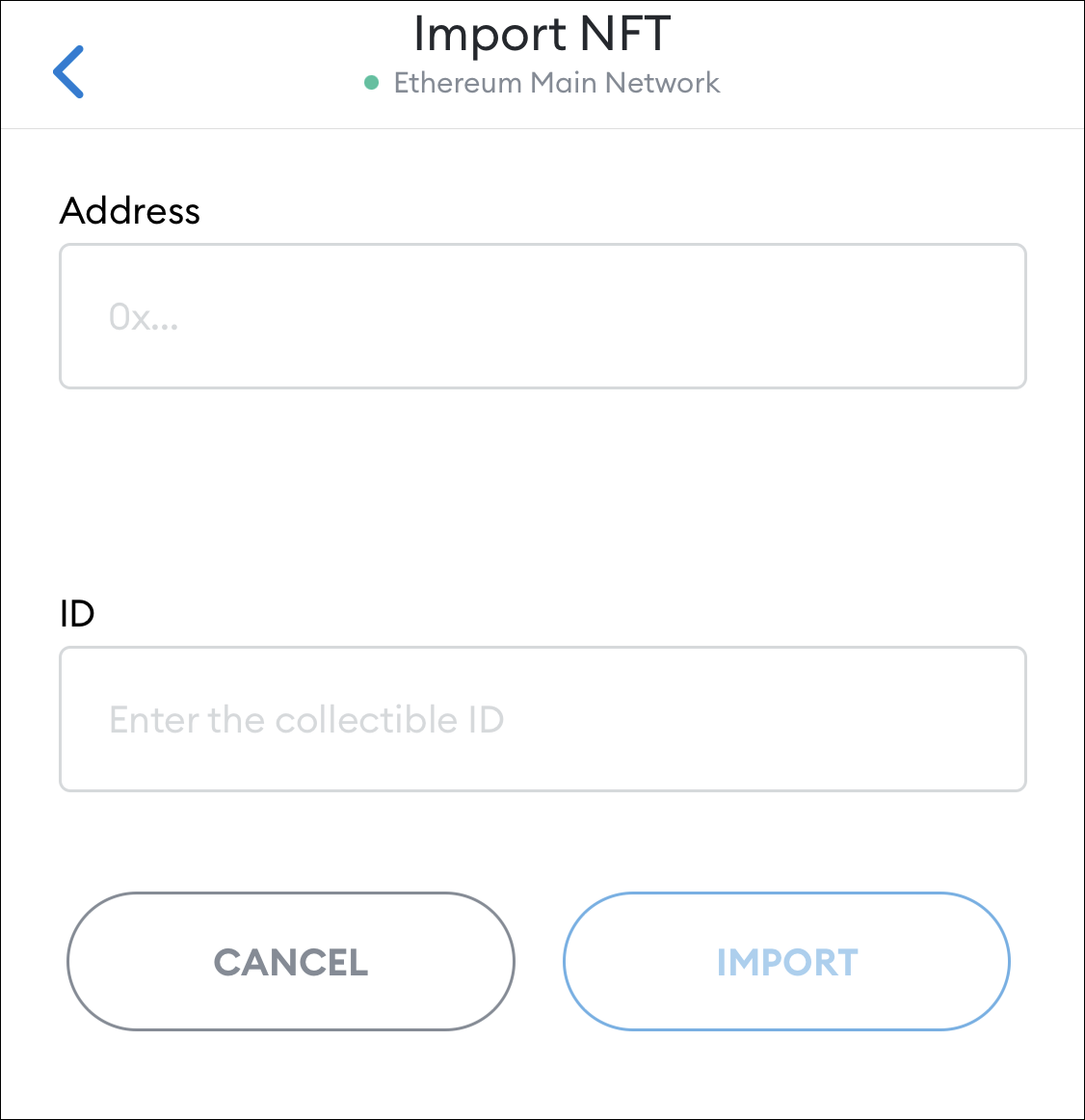 The screen for importing an NFT will open. To import an NFT, you need the address of an NFT along with its ID.