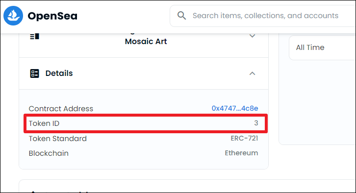 Now, you need the ID for the NFT. Since all NFTs are unique and no two are alike, each collectible has a unique identifier number, i.e., ID. Go back to the Details section on the NFT’s listing page on OpenSea. There you’ll find the ‘Token ID’; enter this number in the ID textbox in the mobile app.