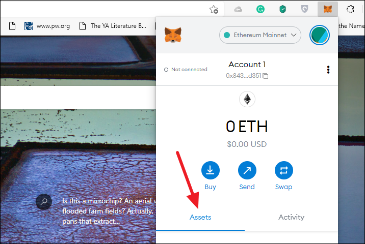 Click the extension icon on your browser to expand the extension menu. You’ll see, that, unlike the mobile wallet, there is no tab for NFTs here. The only options are ‘Assets’ and ‘Activity’. We’ll stay on the assets tab.