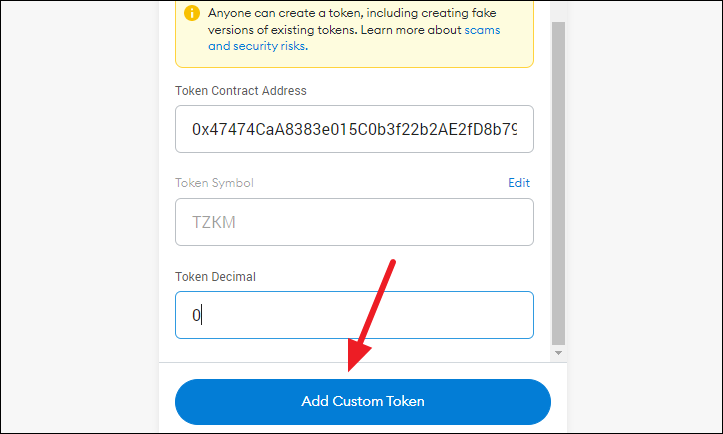 The only remaining option now is for ‘Token Decimal’. When adding an NFT, add ‘0’ (zero) in this field. Then, click the Add Custom Token’ or ‘Next’ button.