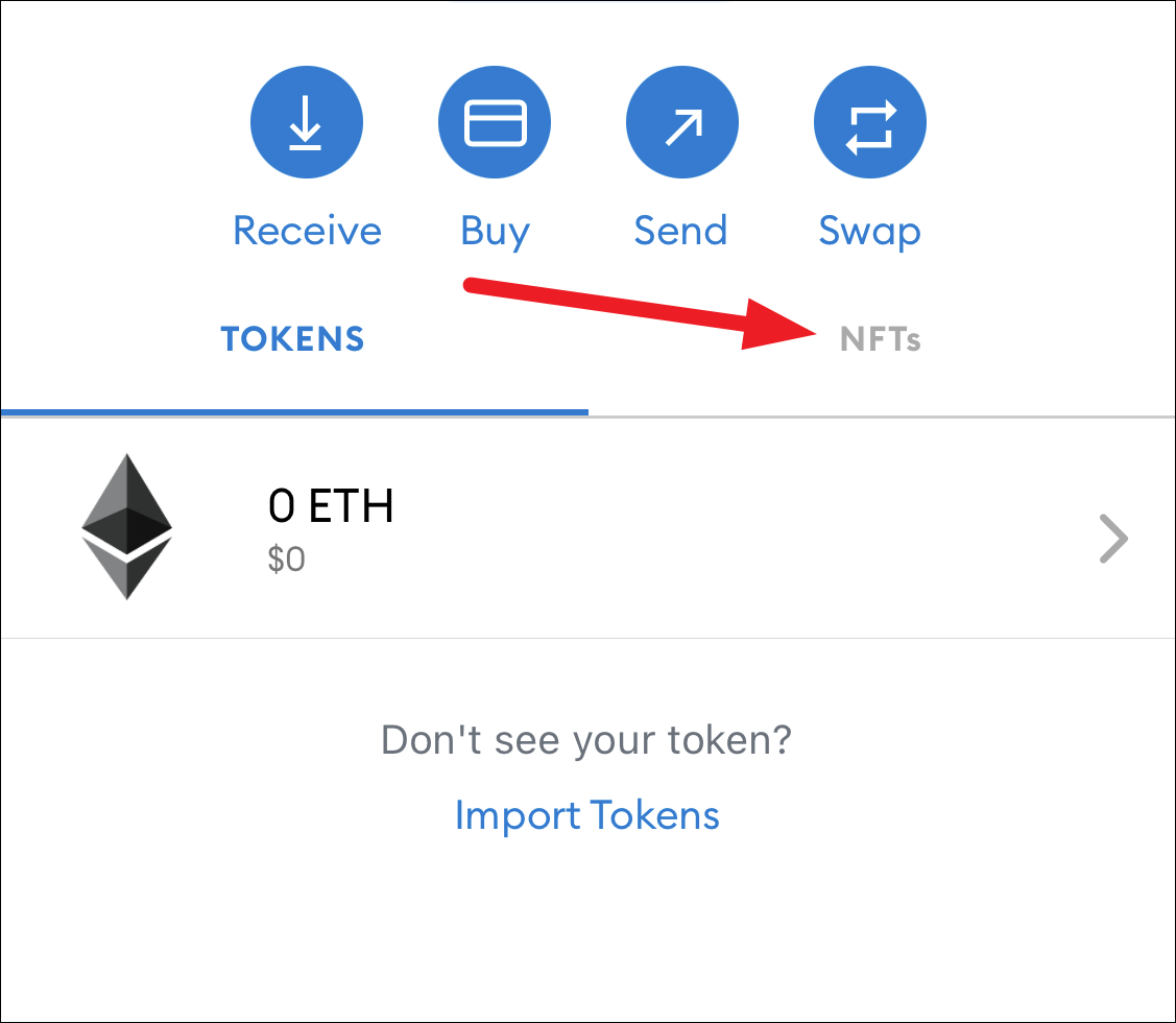 You can view your NFTs here. To add an NFT, scroll down and tap the option for ‘Import NFTs’.