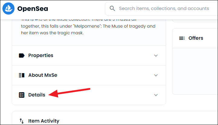 Click the NFT you want to add to your wallet. The listing page for the NFT will open. Scroll down and click the option for ‘Details’.