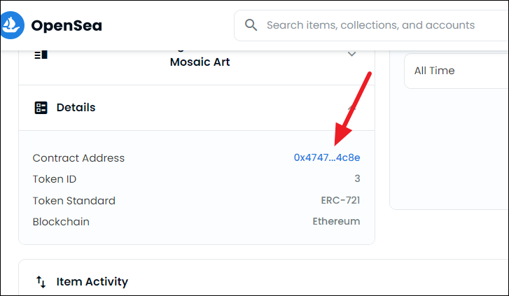 From OpenSea, go to the ‘Details’ section of the NFT and click the hyperlink next to ‘Contract’.