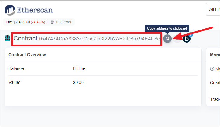 It’ll open the contract’s address on Etherscan. Towards the top-left corner of the page, you’ll find the option for ‘Contract’ with a long string of letters and numbers next to it. This is the address of the smart contract that created the NFT. Click the ‘Copy’ button next to it.