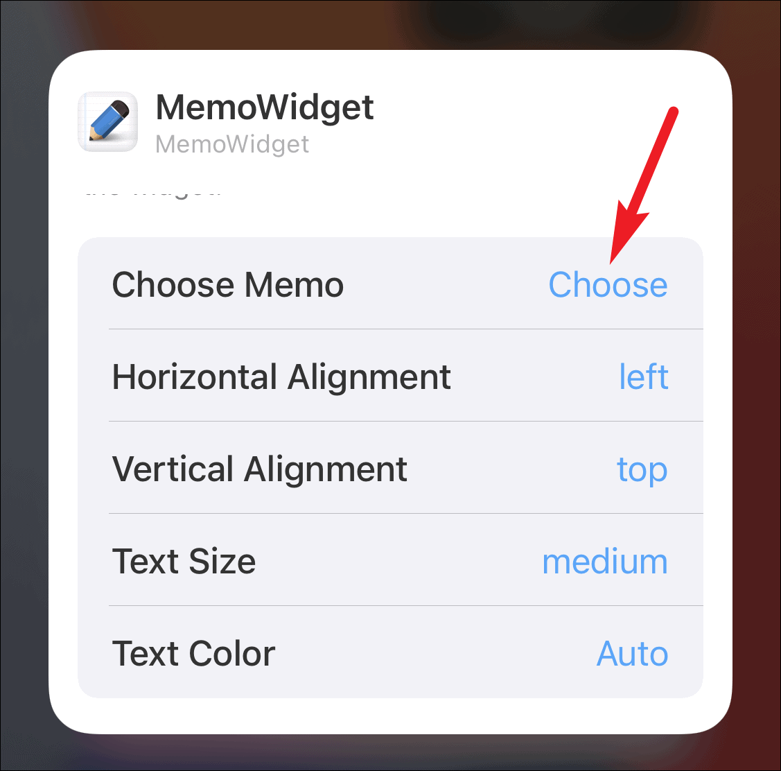 The menu to edit the widget will open. You can also edit the text on the memo like change its horizontal and vertical alignment, size, and color. To select another memo, tap on the ‘Choose’ option next to the ‘Choose memo’ label.
