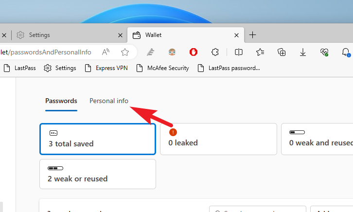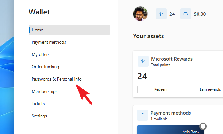 Step 5: In the Wallet tab, select 'Passwords & personal info' from the left sidebar menu.