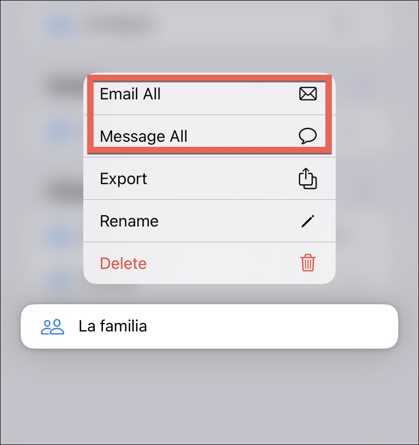 To send a mail or message to all the contacts in the list from the Contacts app, go to the lists screen. Then, long press the list until you receive haptic feedback and a haptic menu appears.