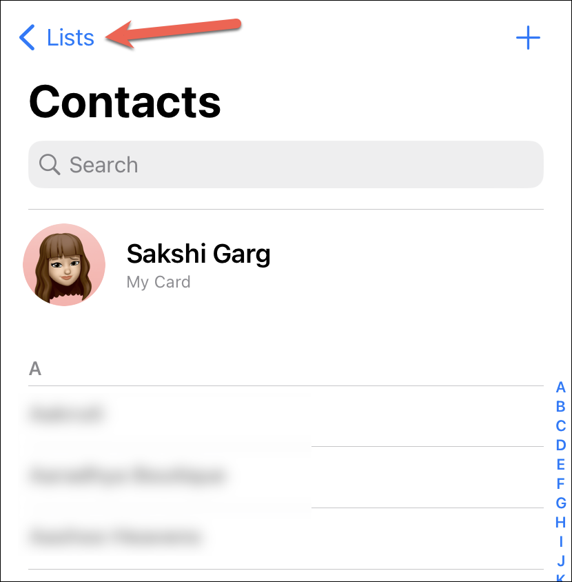 Once the contacts are open, tap the ‘Lists’ option in the top-left corner of the screen.
