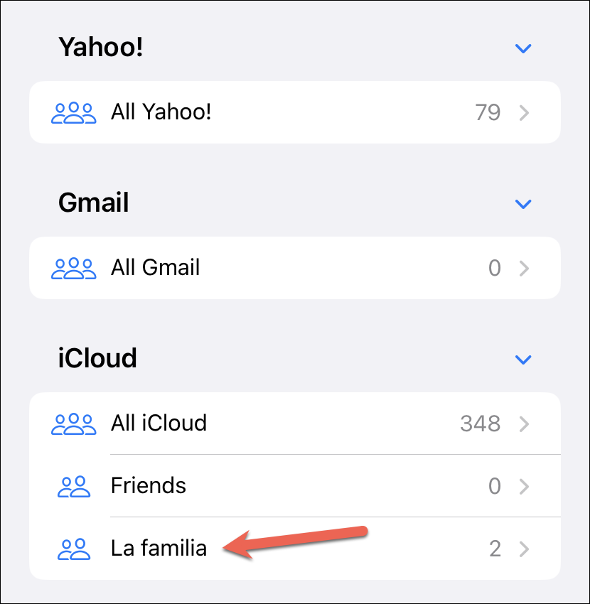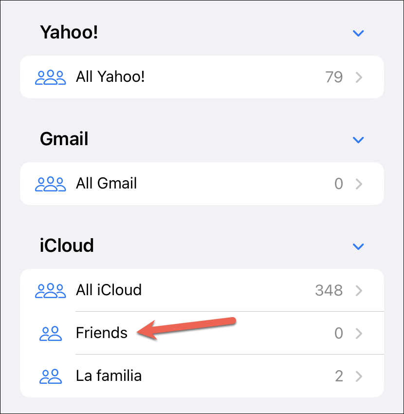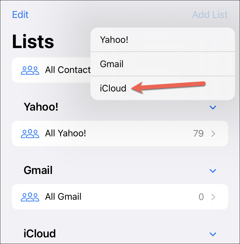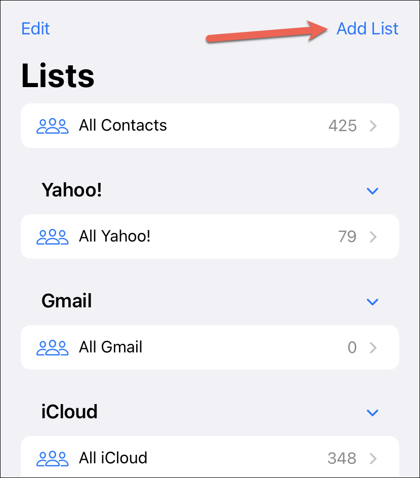 Depending on the accounts on your iPhone, there might already be a few lists, like iCloud, Google, etc, in addition to the ‘All Contacts’ list. You cannot modify any of these linked lists. But you can create a new one for either account.